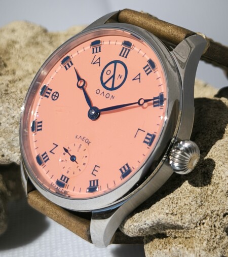 THE WATCH INCORPORATES DETAILS RELATED TO ANCIENT GREECE SUCH AS THE NUMERALS, THE TEMPLE LIKE HOUR MARKERS AND THE GREEK WRITING.