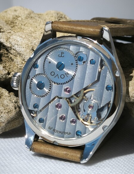 AT THE BOTTOM OF THE MOVEMENT “ΙH’ ΡΟΥΜΠΙΝΙΑ” HAS BEEN ENGRAVED INDICATING THAT THE MECHANICAL HAND WOUND MOVEMENT HAS 18 RUBIES.
