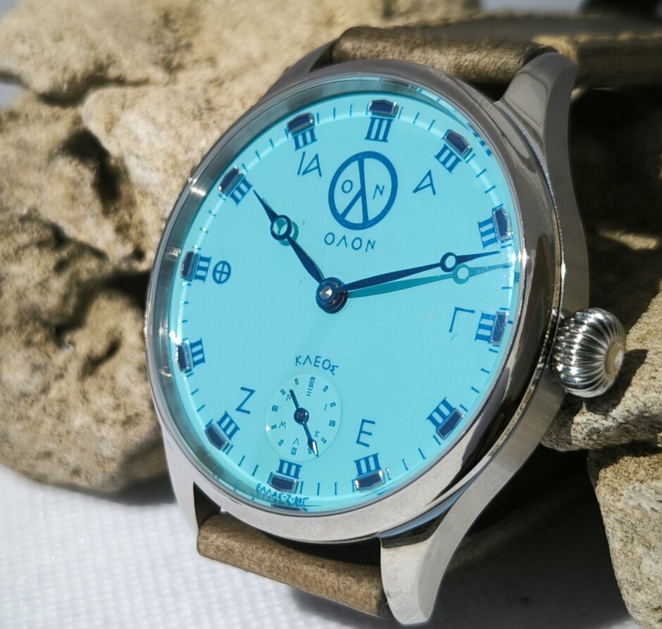 OVER THE SMALL SECONDS THE NAME “ΚΛΕΟΣ” IS WRITTEN IN CHARACTERISTIC NAVY BLUE COLOR.